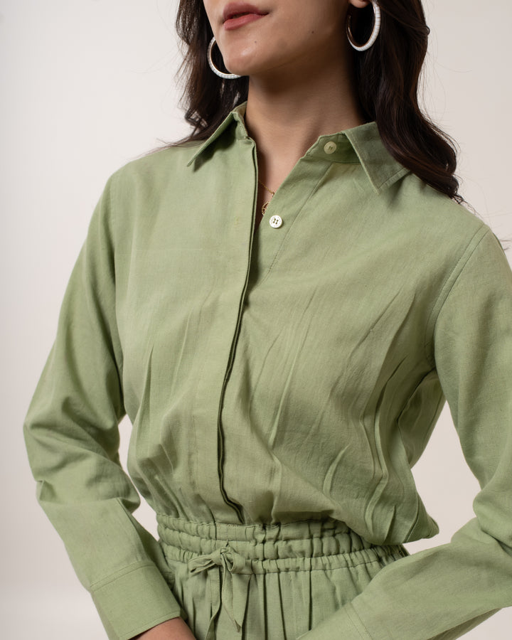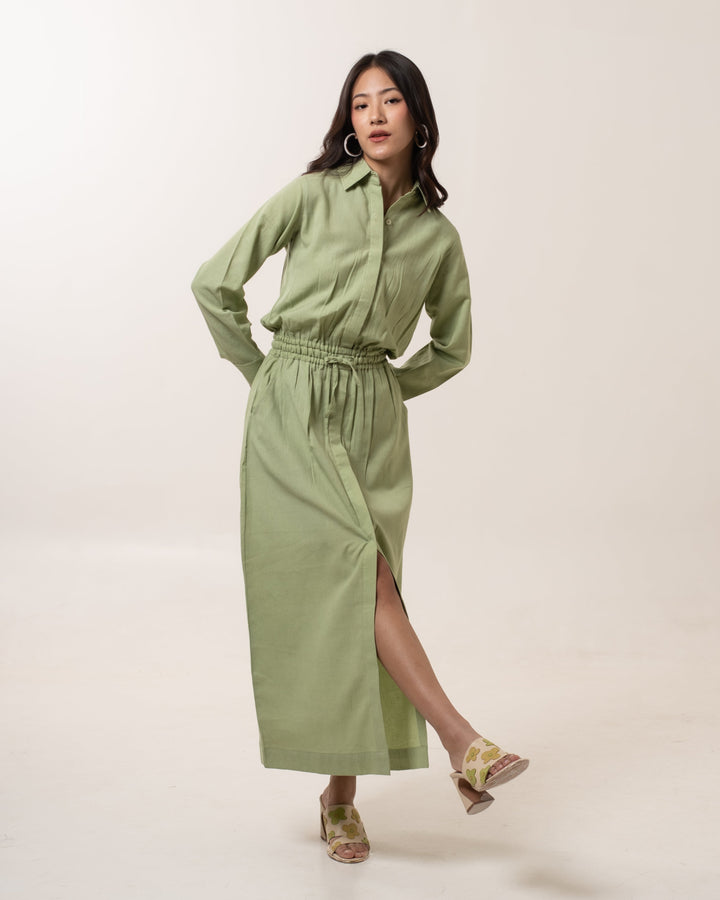 Dress Details: Shirt-Style Full-Length Dress, Collared, Button Front, Center slit, Long Sleeves