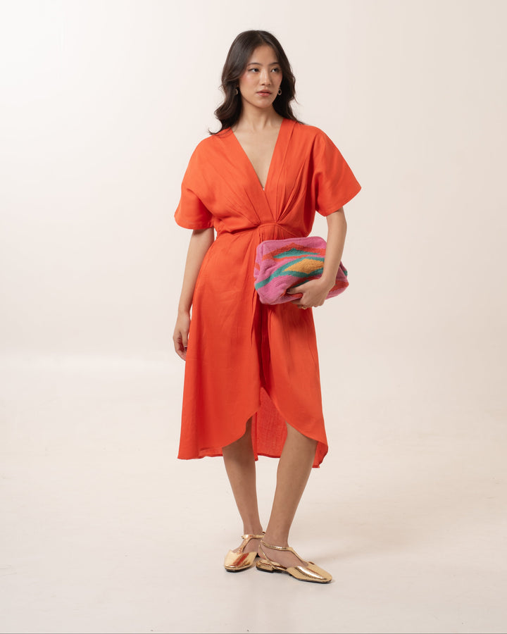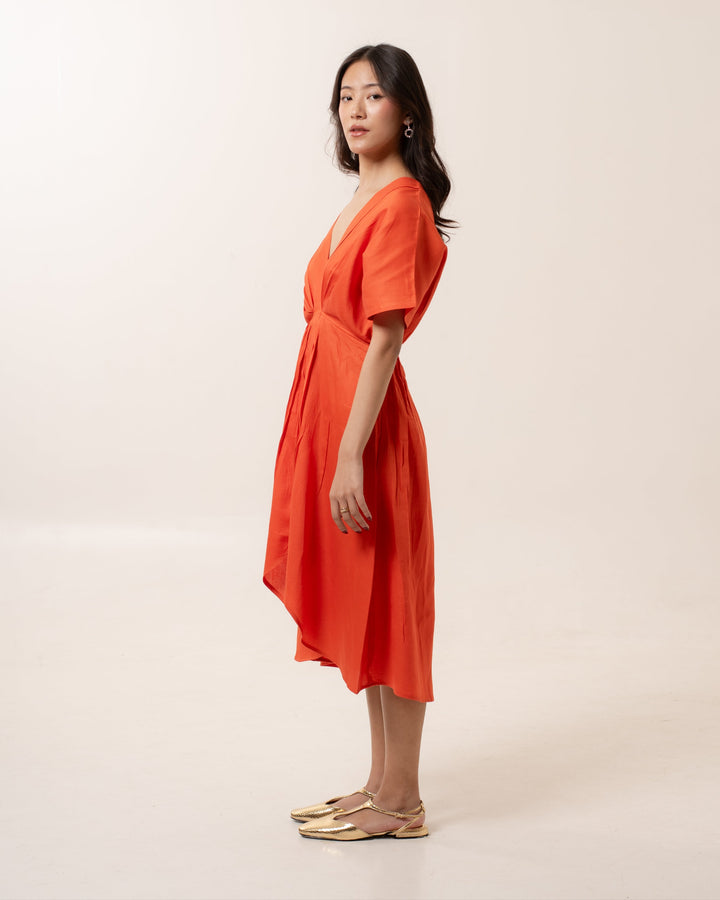 Dress Details: Midi, Box Pleats, Deep V-Neck, Short Sleeves, Asymmetrical Hem
