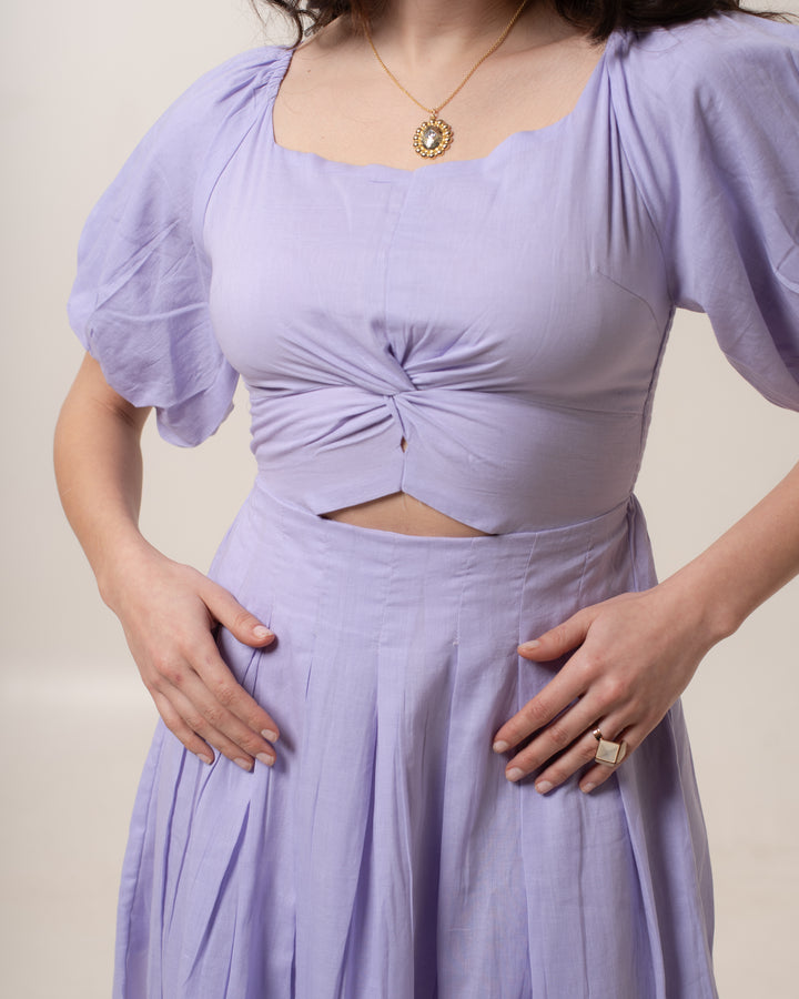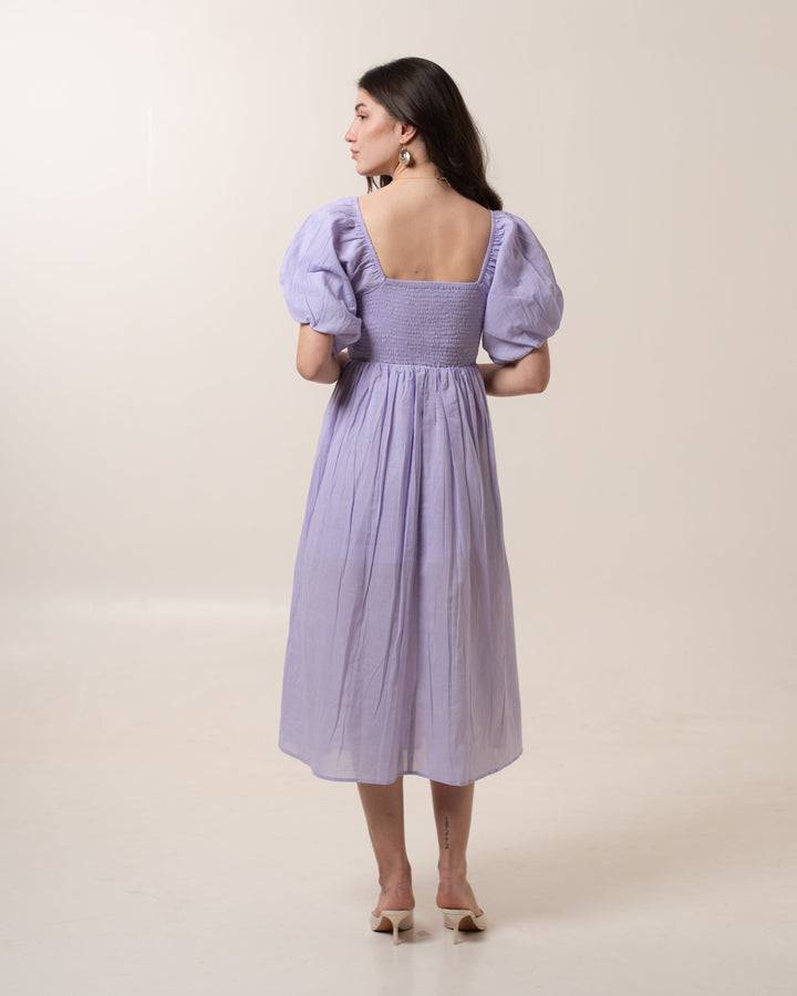 Dress Details: Midi, Puff Sleeves, Front Knot With Cutout, Smocked Back