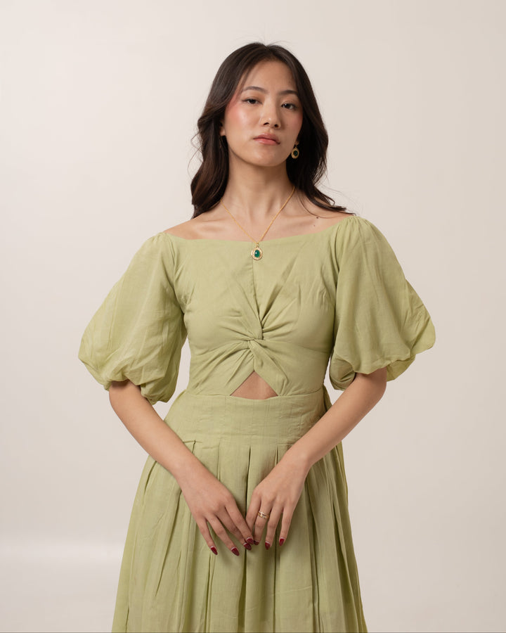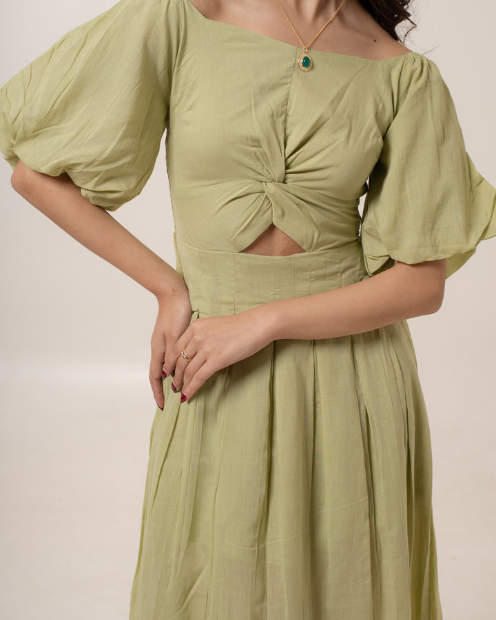 Dress Details: Midi, Puff Sleeves, Front Knot With Cutout, Smocked Back