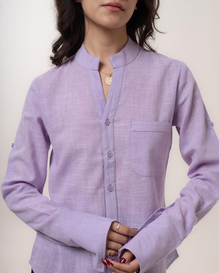 Top Details: Mandarin Collar, Chest Pocket, Curved Hem