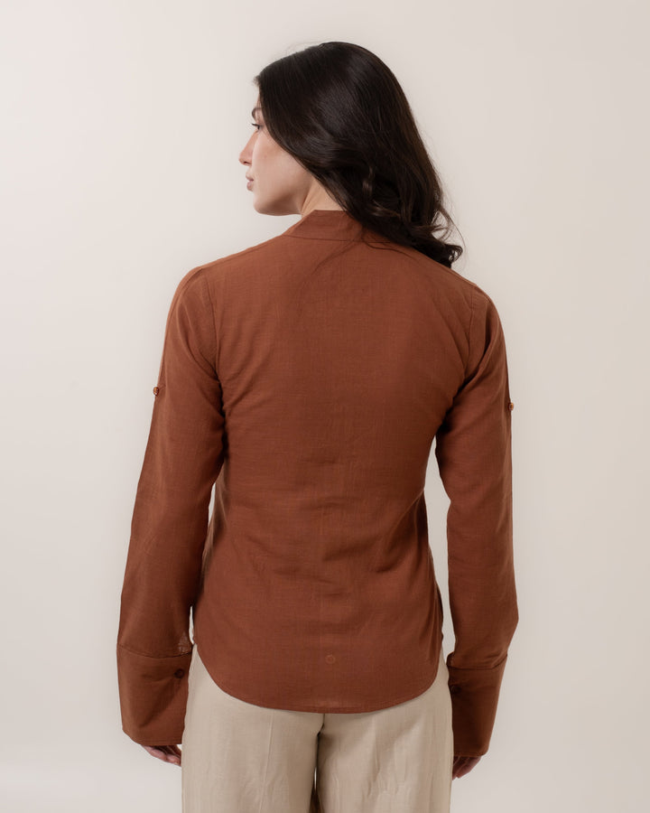 Top Details: Mandarin Collar, Chest Pocket, Curved Hem