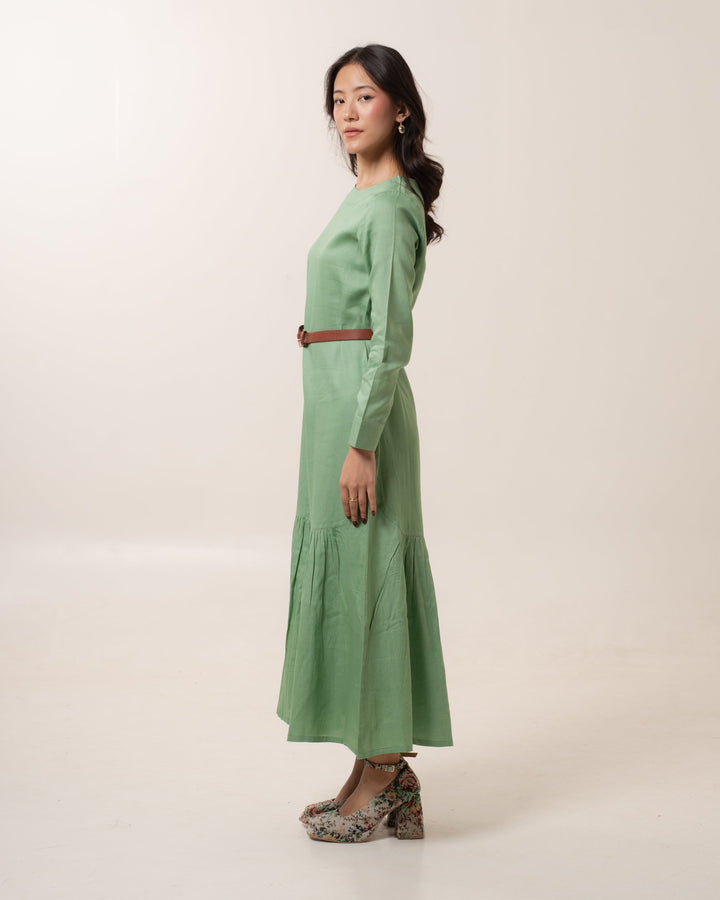 Dress Details: Maxi, Round Neck, Gathered Lower Panel, Full Sleeves