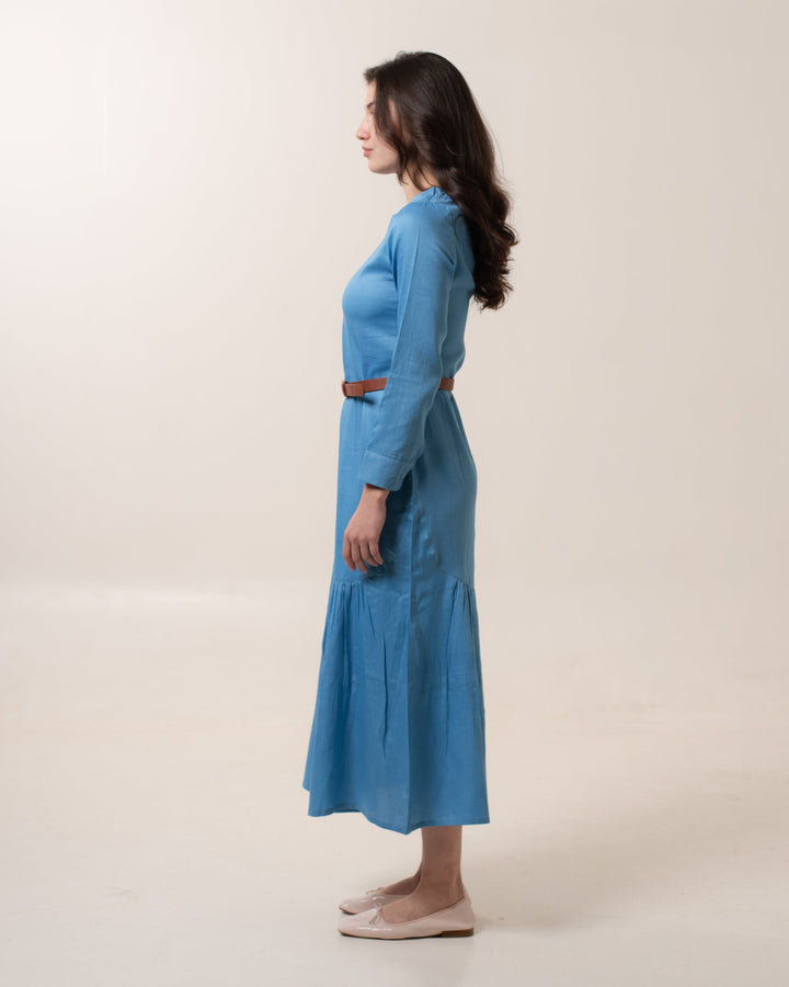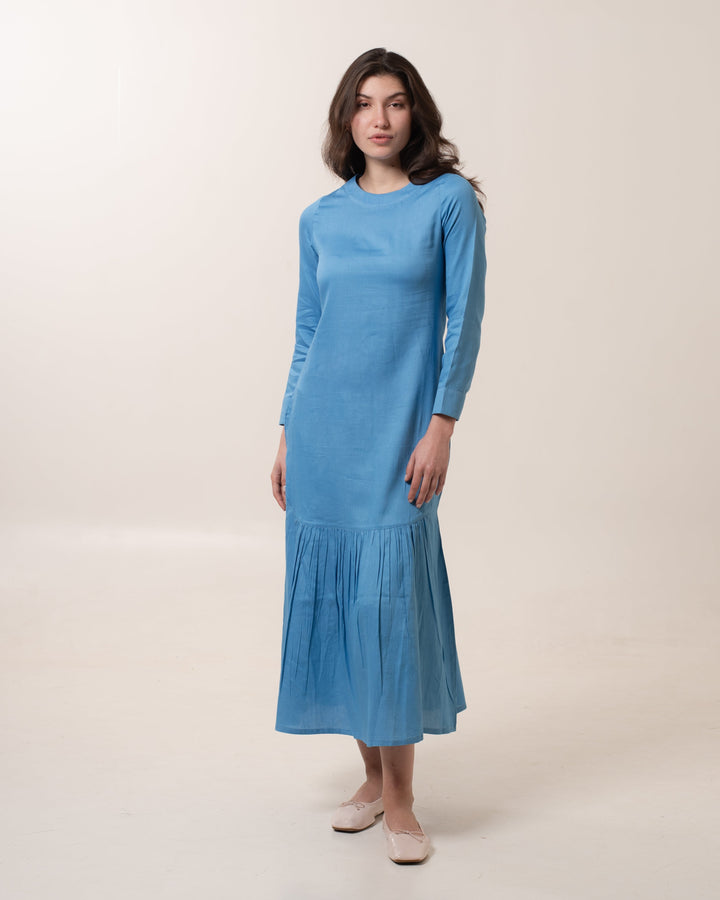 Dress Details: Maxi, Round Neck, Gathered Lower Panel, Full Sleeves