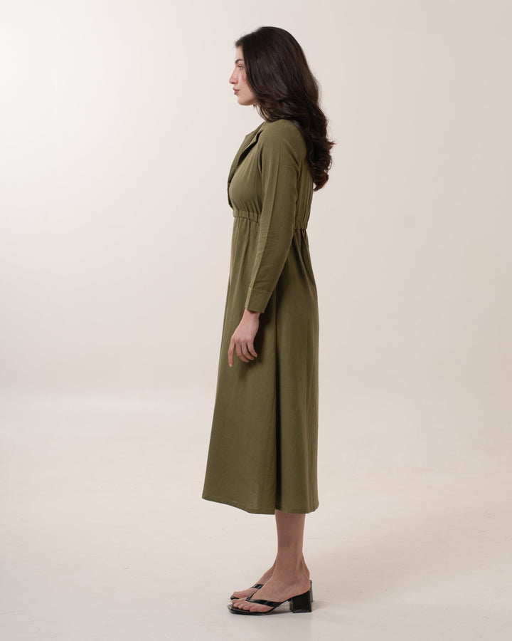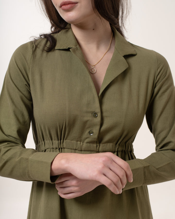Dress Details: Shirt-Style Midi, Collared, Button Front, Long Sleeves with Buttoned Cuffs